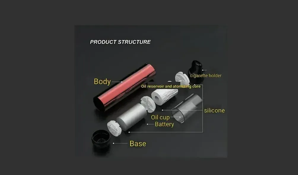 Its main structure includes the mouthpiece, atomizer core, oil cup, base, sealing silicone, connector, etc.