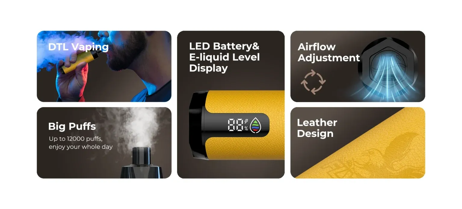 High capacity: up to 12,000 puffs thanks to the 18 ml e-liquid volume