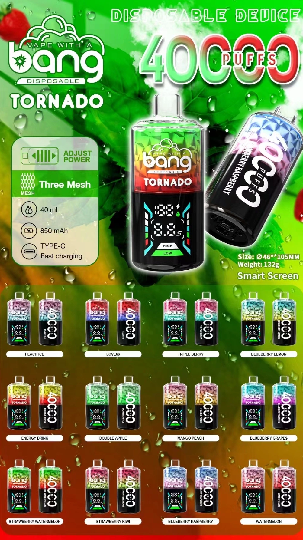 Bang Tornado 40000 Puffs Large Smoke LED Display Disposable Vape delivers the ultimate vaping experience with its cutting-edge features and long-lasting performance. Designed for up to 40000 puffs, it boasts an enormous 40mL e-liquid capacity, making it ideal for extended usage without constant refills or replacements.
