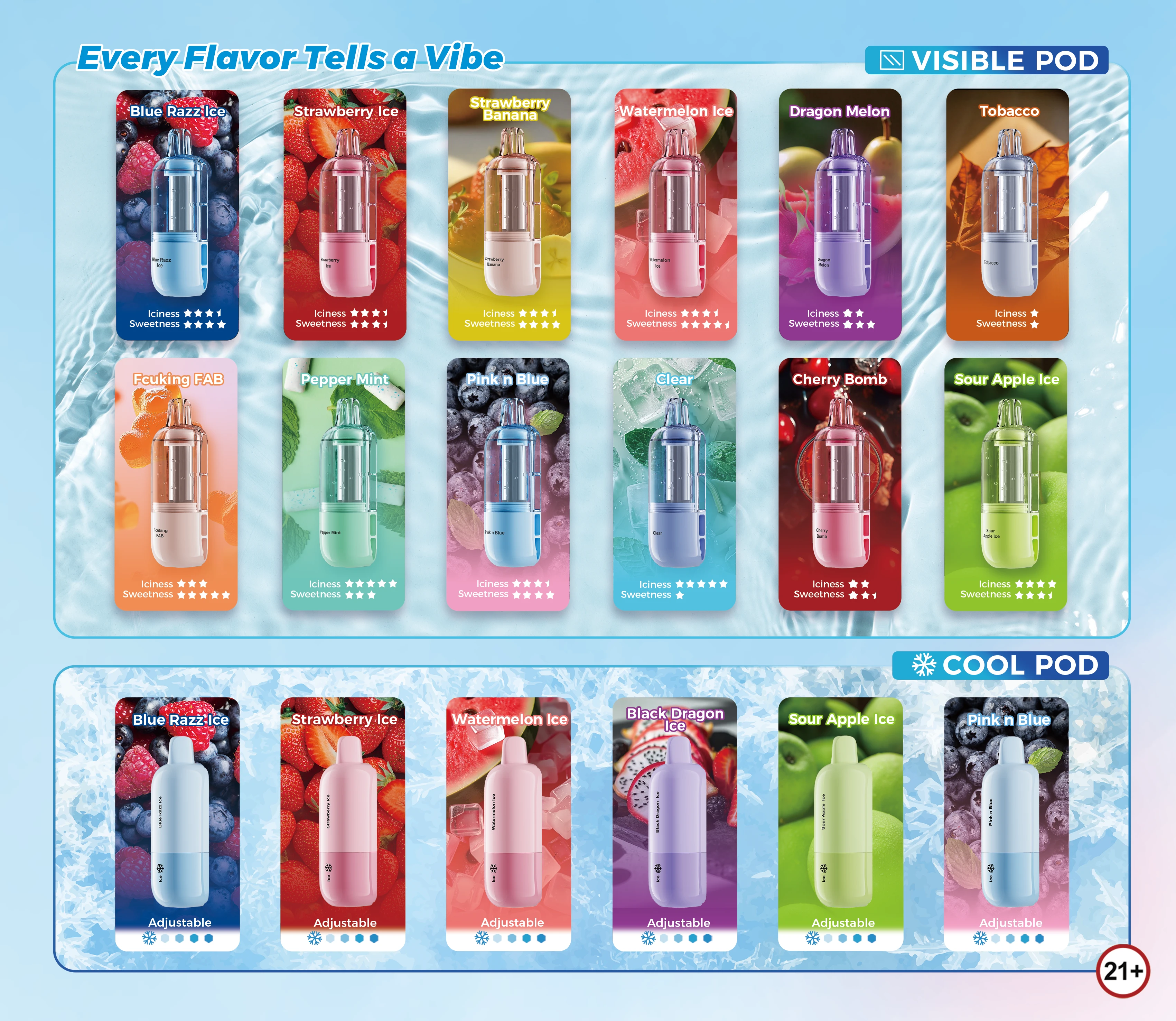 • Pods: The Visible Pod (Crystal Tank) and the Cool Pod (4-Level Adjustable)
